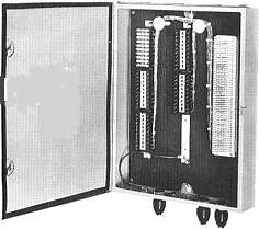 Aluminum housing complete with back board, two protector mounting strips three cable couplings for cable OD .560 to .690 (P/N 2674), one 25 pair nut & stud terminal strip, auxiliary ground strip, five distribution posts, fanning strips and