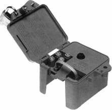 an RJ11 plug and jack with a weather resistant grommet, a customer wiring bridge, a provision for mounting an optional half-ringer termination or MTU circuit, and a hinged top cover with customer wiring instructions. The lockable cover has a Telco override for service entrance